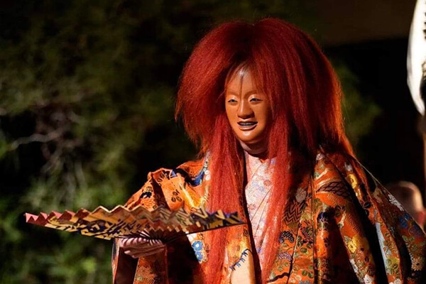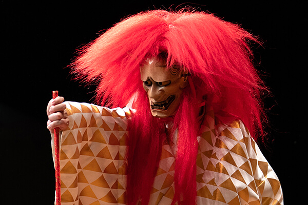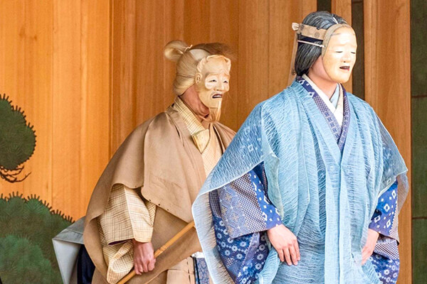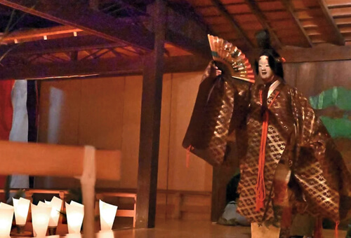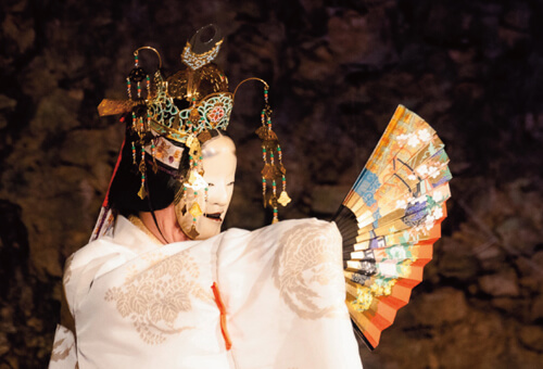 笛や太鼓の音、謡(うたい)と呼ばれる声楽に合わせて舞い、物語を紡ぐ歌舞劇です。
